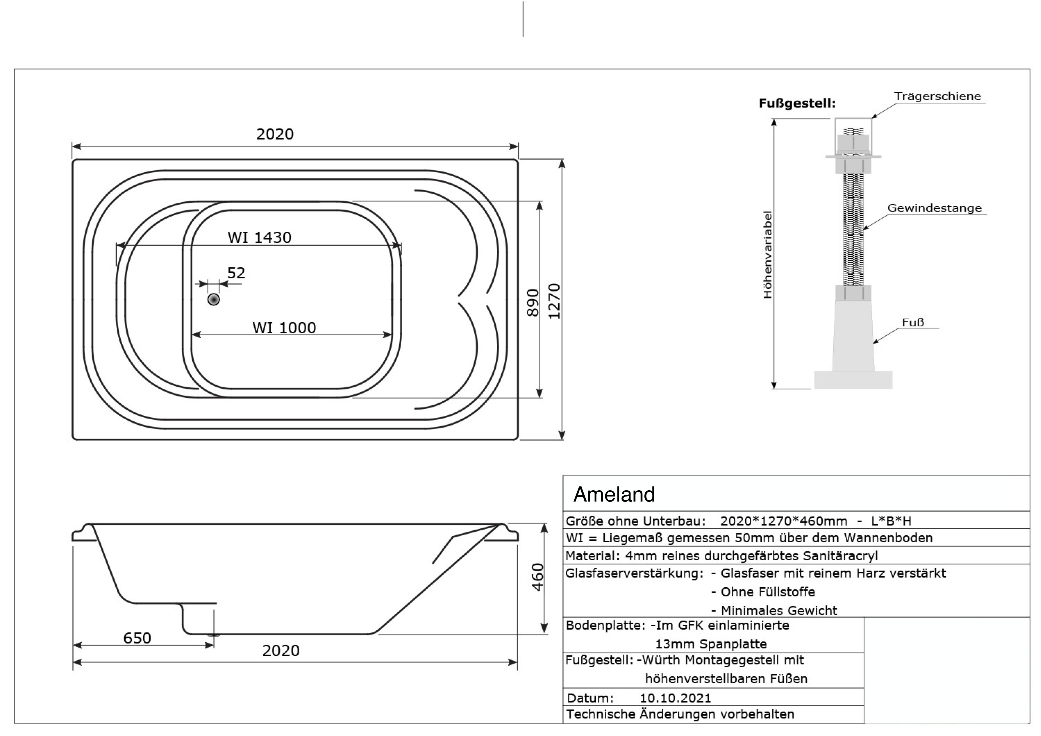 | Wannenträger/Fußgestell: | bereits montierte, rostfreie Stahlschienen inkl. höhenverstellbarer Wannenfüße |